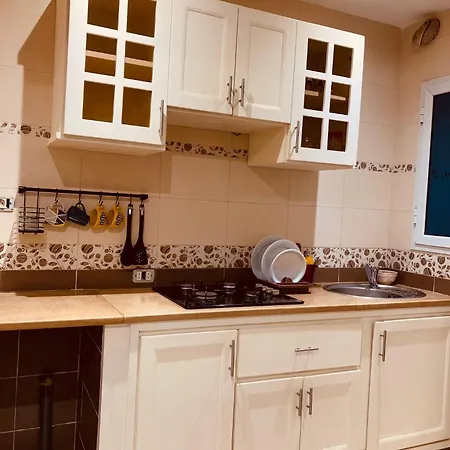 Es gibt eine voll ausgestattete Küchenzeile mit Küchenausstattung, darunter ein Kühlschrank und Küchenutensilien. Das Apartment ist in der Nähe von der Stadtbahn Ettahrir gelegen.